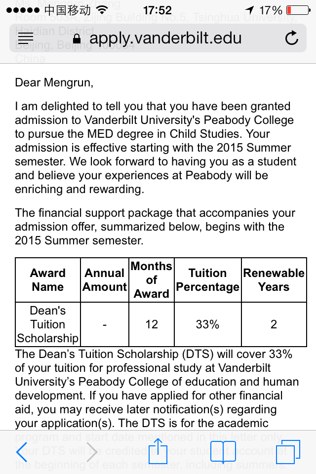 作者简介:张梦润,清华大学经济管理学院,信息管理与信息系统专业本科生,TOEFL成绩101分。2014年申请,她斩获了范德堡大学(Vanderbilt)、哥伦比亚大学(Columbia)、纽约大学(NYU)儿童教育专业Offer三枚。其中范德堡大学(全美教育学专业排名第3)资助其1/3学费。