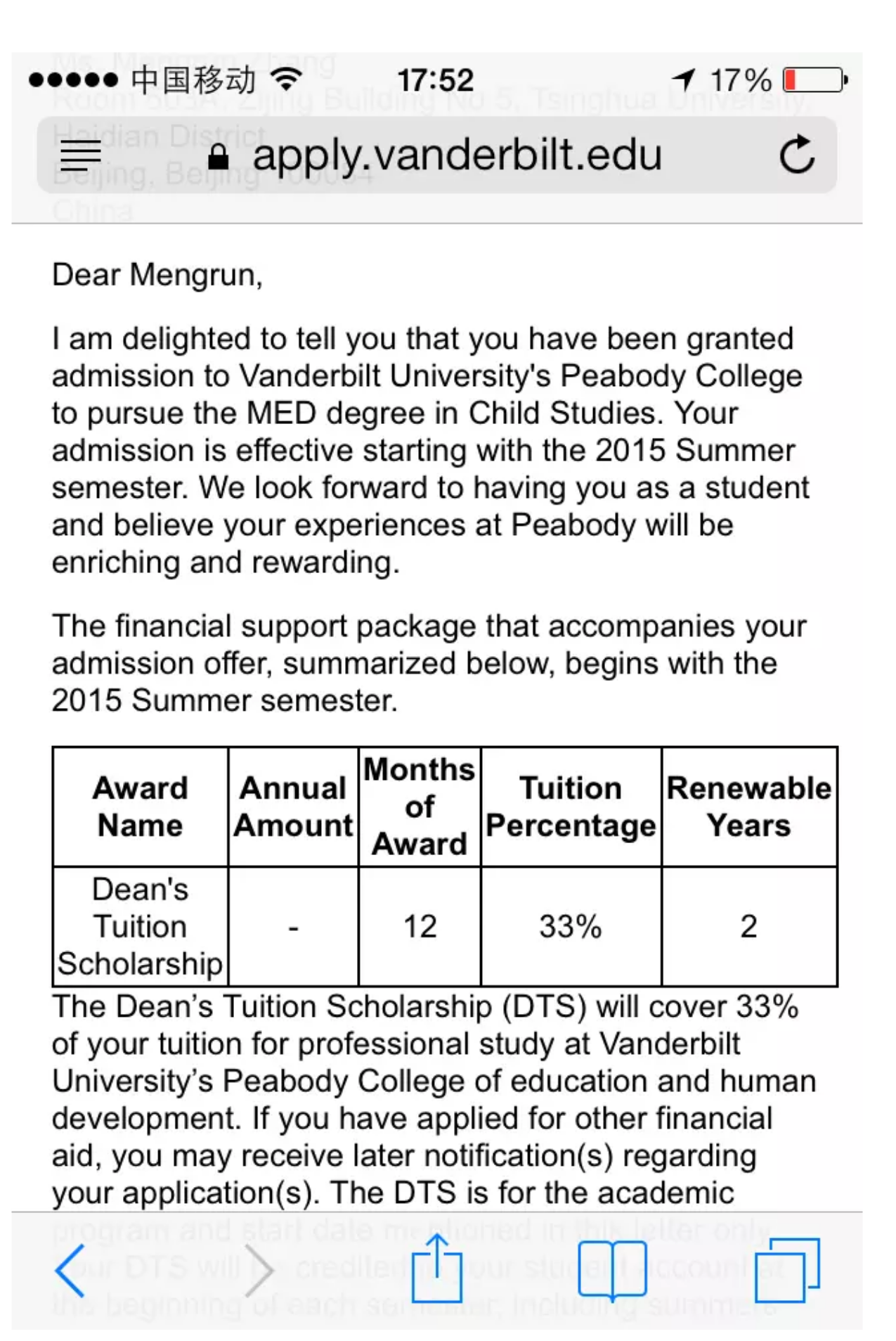 作者简介:张梦润,清华大学经济管理学院,信息管理与信息系统专业本科生,TOEFL成绩101分。2014年申请,她斩获了范德堡大学(Vanderbilt)、哥伦比亚大学(Columbia)、纽约大学(NYU)儿童教育专业Offer三枚。其中范德堡大学(全美教育学专业排名第3)资助其1/3学费。
