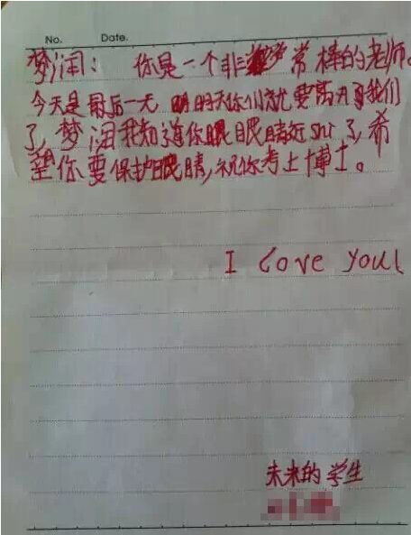 在后来的接触中我才知道,那个受伤的男孩叫小名,是学校里出了名的捣蛋鬼。他不守纪律、上课大声说话甚至随意出入教室。但这个常常让老师头疼的孩子在我们即将离开的时候,却悄悄地塞给我一张小纸条,上面写着“老师我爱你,希望以后都能做你的学生,祝你考上博士,希望你的眼睛能变好……”