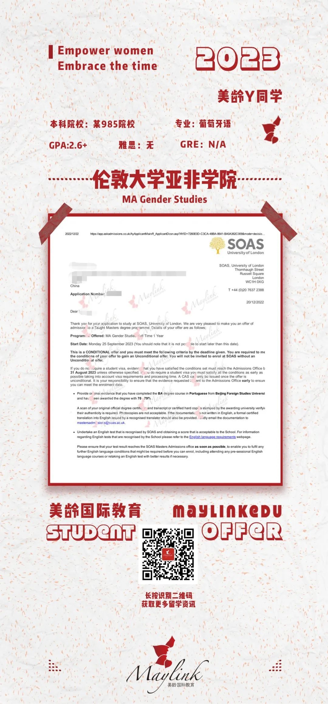 最初找到我们是想申请志奋领奖学金,因为信任,决定留学也通过我们办理,在我们的帮助下,很快拿到的soas offer,目前正安心等其他offer并学习语言!