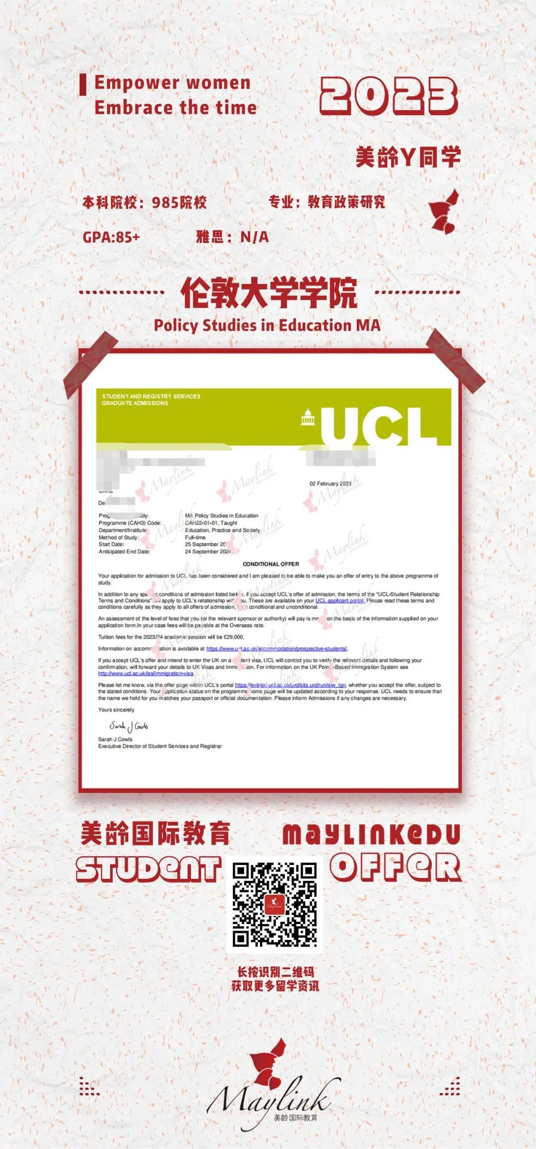 又斩获UCL教育政策研究硕士